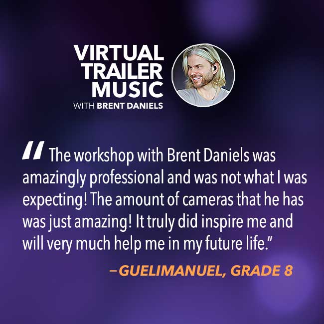 The Virtual Trailer Music workshop is as one-of-a-kind, inspirational experience! During this deep dive, students learn how their everyday devices are used by professionals like Brent to create the music and sounds they hear everyday in blockbuster movie, TV and video game trailers.