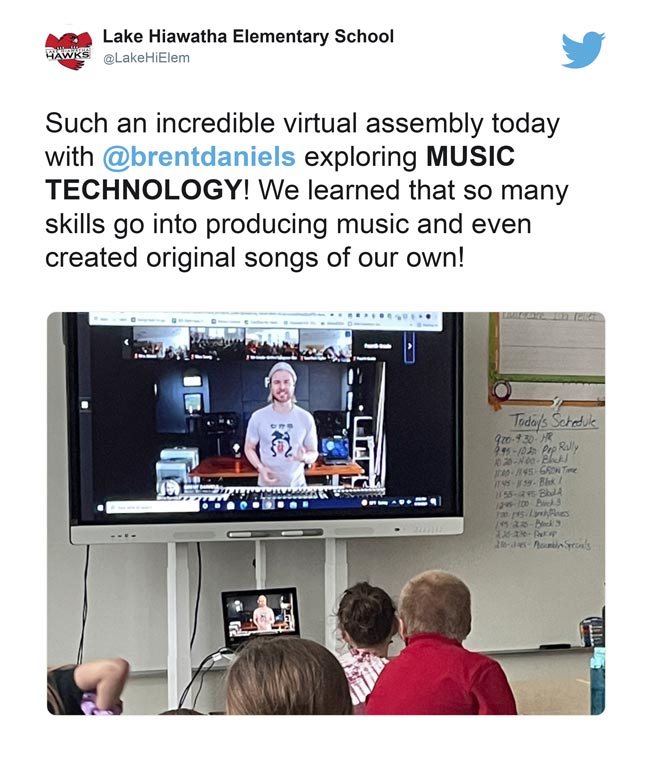 A reinvention of the traditional in-person school assembly, music industry veteran Brent Daniels broadcasts from his production studio utilizing a cinema-quality HD multi-camera setup, concert-quality audio, and a truly unique approach to remote audience interactivity,
